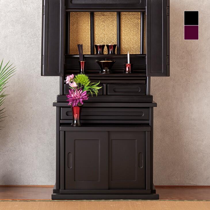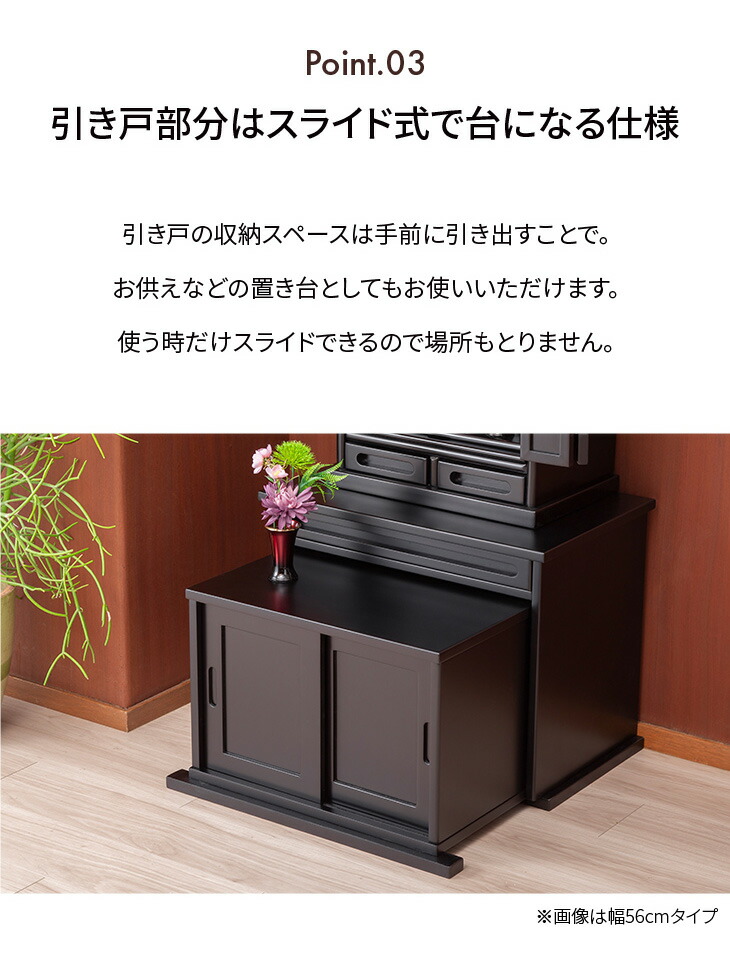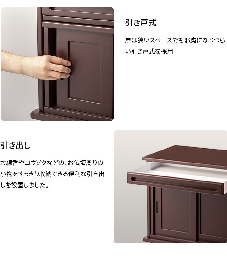 上置きタイプの仏壇にあわせやすい、仏壇専用の下台。引戸の部分は前にスライドさせれば台になり、読経やお供えに便利です。紫檀調、黒檀調の2種類をご用意しました。下台を使うと座ってちょうど良い高さになります。