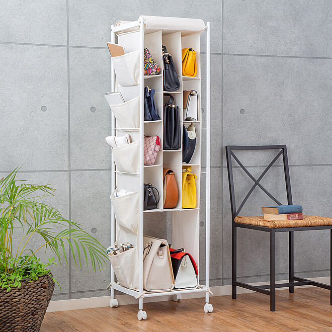 バッグの型崩れを防ぎ、スマートに収納してくれるバッグ専用の収納ラック。小さなバッグも大きなバッグもスマートボディにたくさん収納できます。下段の間仕切りが取り外せるのでトートバッグなど大きなサイズのバッグも収納可能!サイドにポケット付きで手袋やマフラー、ストール、サングラスなどの小物も収納できます。大切なバッグをホコリや日差しから守るカーテン付き、さらにキャスター付きで移動もラクラク!