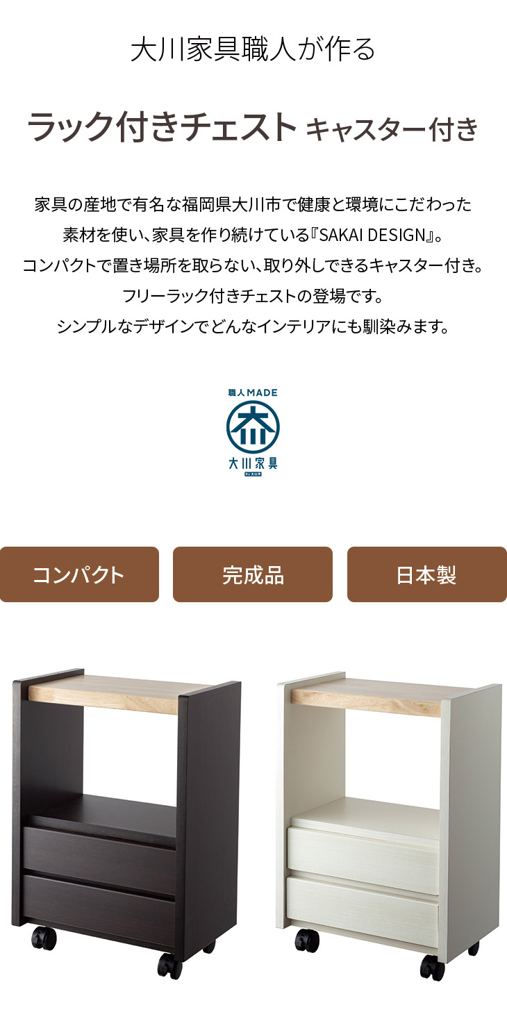 サイドワゴン キャスター付き サイドチェスト サイドボード デスク下収納 コンパクト 職人が作る ラック付きチェスト 大川家具 日本製 完成品【代金引換不可】