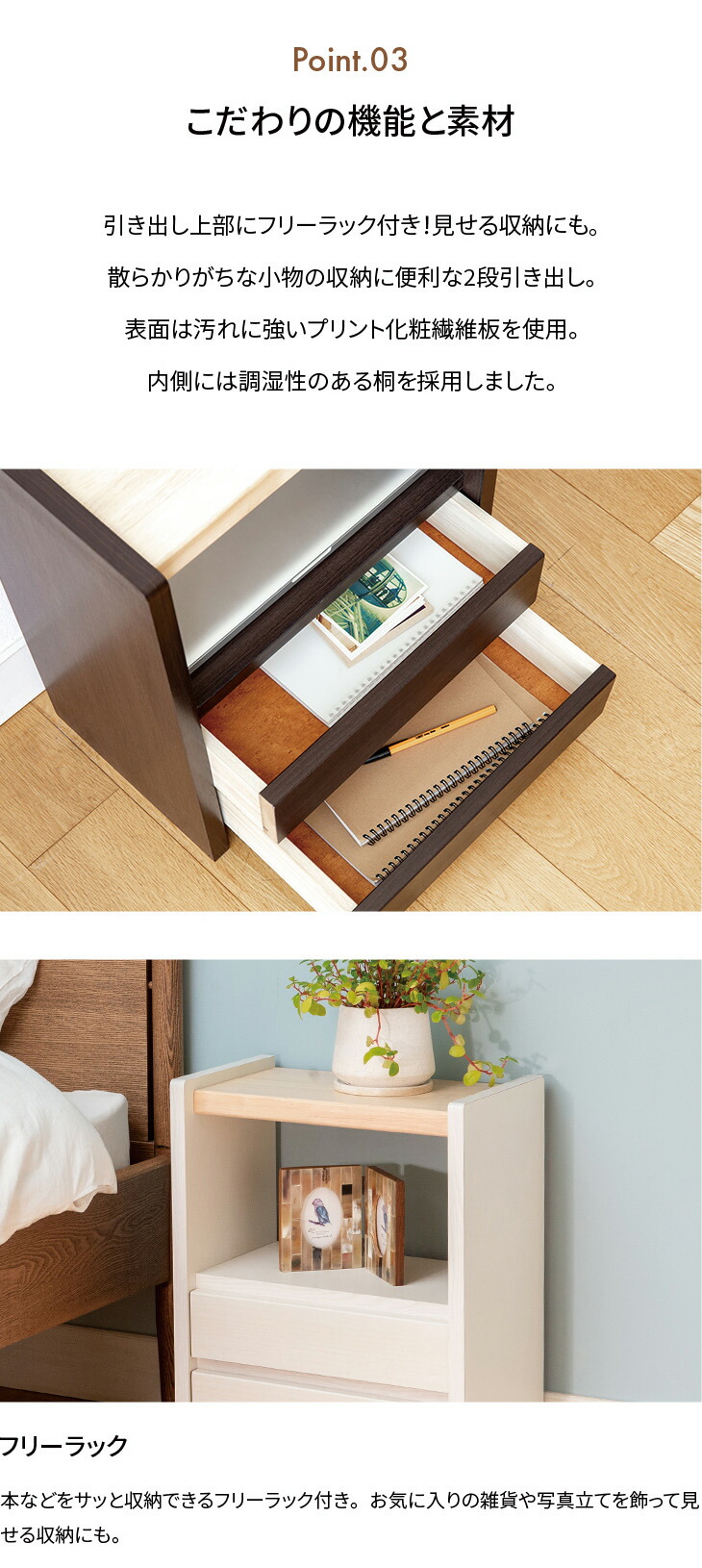 ●素材/本体:プリント化粧繊維板、桐、天然木(ラバーウッド)