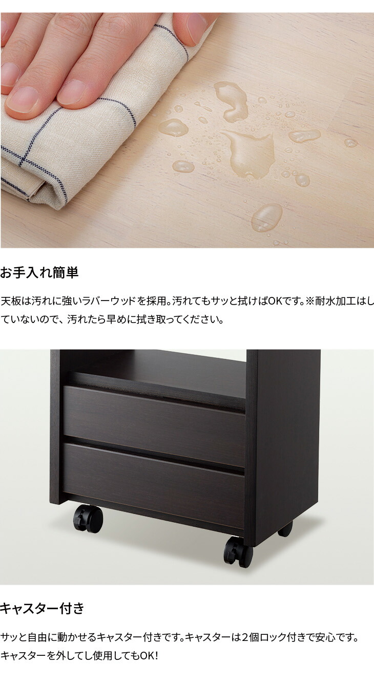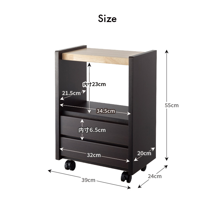 ●サイズ/約幅39×奥行き24×高さ55cm(キャスター含む)、引き出し内寸:約幅32×奥行き20×高さ6.5cm、オープンスペース内寸:約幅34.5×奥行き21.5×高さ23cm