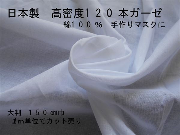 ガーゼ 生地 綿100% ホワイト 手作りマスクに 送料無料 150センチ×1m単位でカット売り 国産 高密度 120本ガーゼ シングルガーゼ