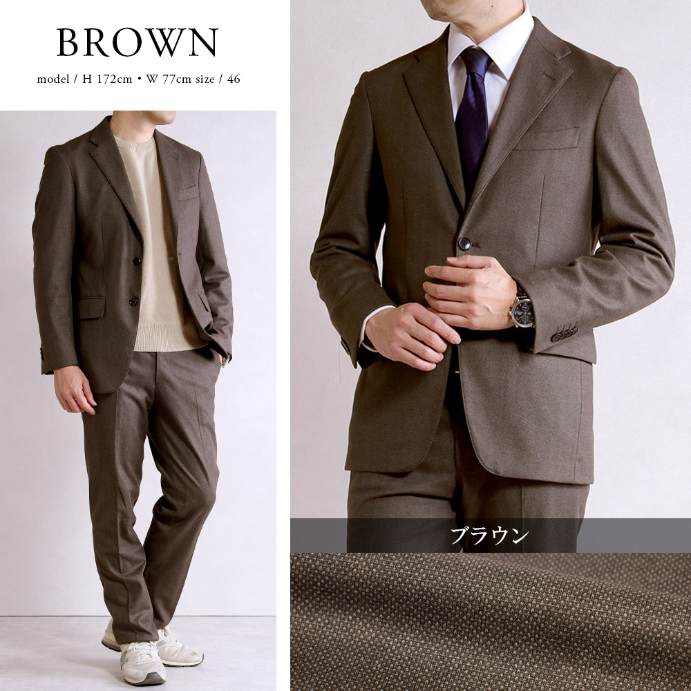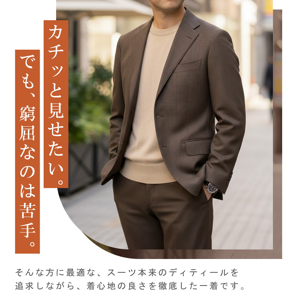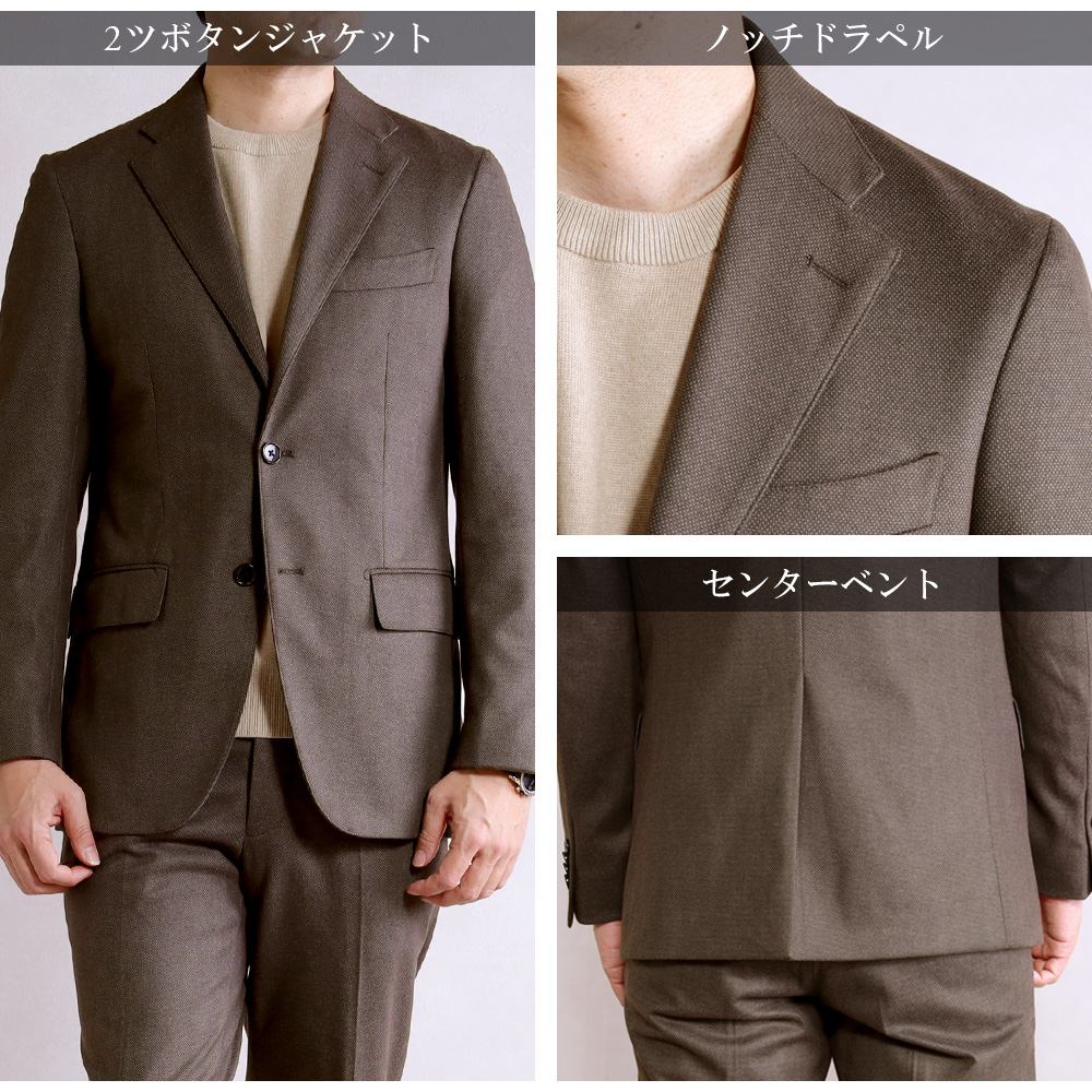 アウトレットスーツ オフィス カジュアル ゴルフ バーズアイ調 ニット素材 しわになりにくい 軽量 暖かい 茶 スマートスタイル 標準 スリム リラックス 2ボタン シングルスーツ メンズファッション 20代 30代 40代 50代 伸縮 伸びる オシャレ 紳士服 男性用 テレワーク シングルジャケット 旅行 出張 アウトレット ストレッチパンツ