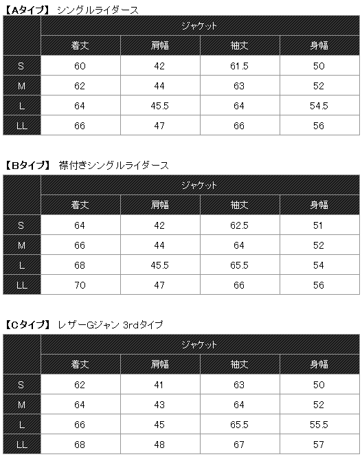 | 仕様 | ・シングルライダース ・襟付きシングルライダース ・レザーGジャン 3rdタイプ
