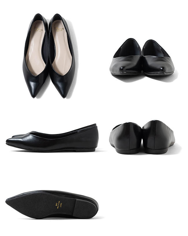 シンプルなフラットパンプスに、Vカットの履き口が足を華奢に演出。