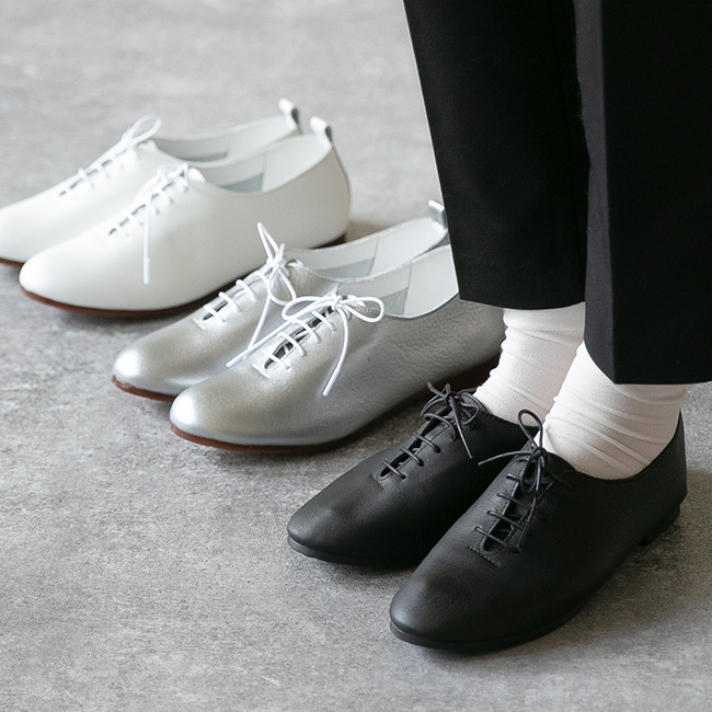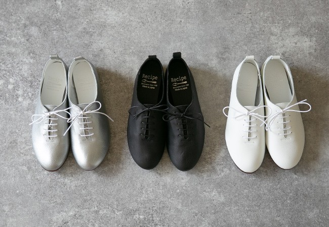 『軽やかに足を運んでくれる本革レースアップシューズ』履き心地にこだわった一足国産の材料をもとに静岡の自社工場にて1足ずつ丁寧に生産しております。創業50年以上の靴作りのノウハウを活かし、日本人の足に合う木型でトレンドに左右されず、長くご愛用していただける靴です。やわらかく足当たりのいい素材天然皮革ならではのやわらかさ。まるで履きならしてきたような素材がやさしく足に馴染む。シボ感のあるレザーが高級感UP。光沢の抑えたマットな質感が上品な大人を演出。インソールはRecipeのオリジナルロゴがプリントされており、脱いでもかわいい。