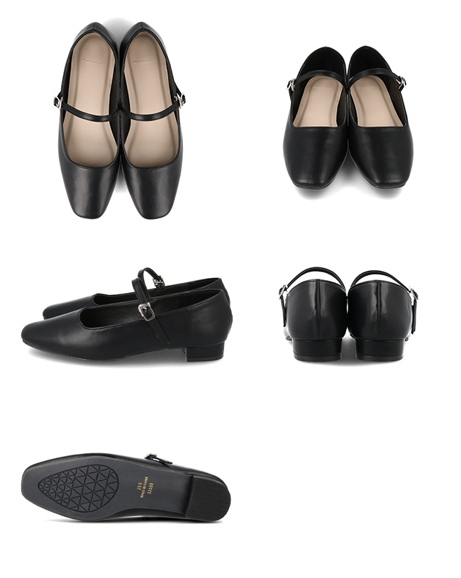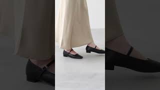 やや細身のスクエアトゥに細身のストラップがすっきりした足元に魅せるパンプス。