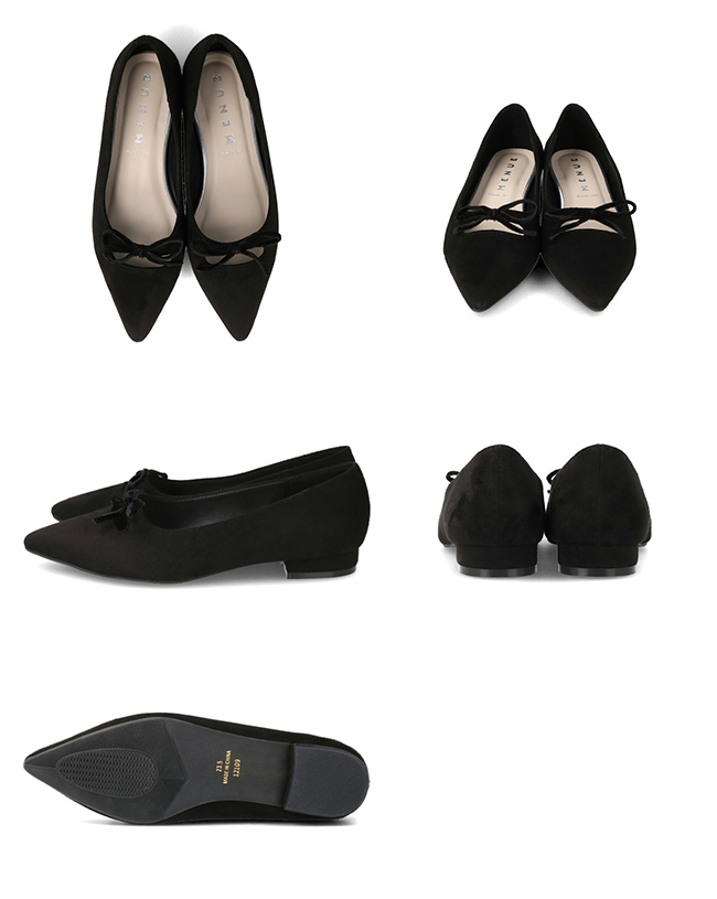 トレンドのリボンデザインは、ベロア生地とポインテッドトゥで可愛くなりすぎない。