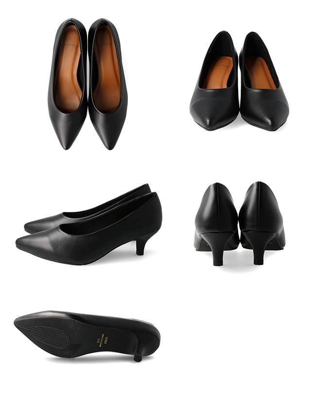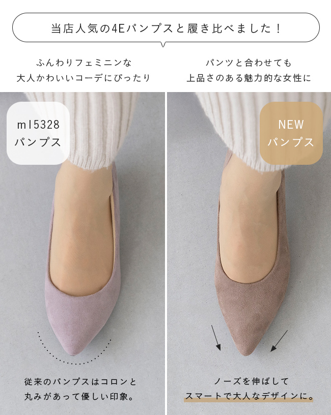 お客さまからご好評いただいている、従来の幅広さん向けパンプス(m15328)はコロンと丸く優しい印象。