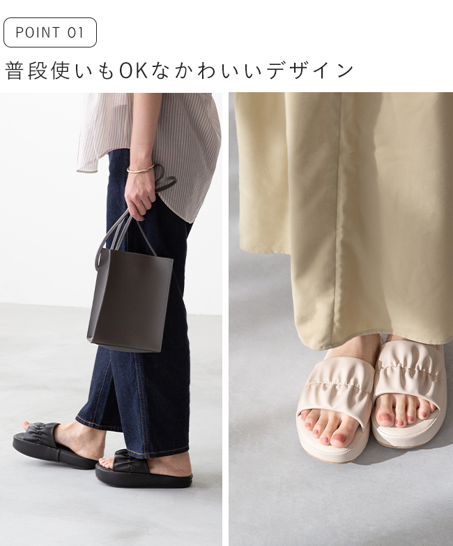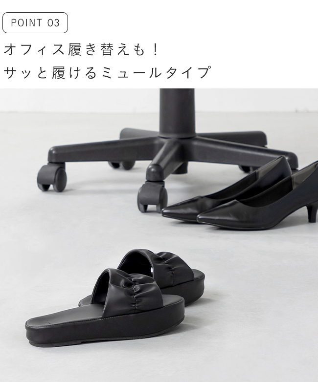 かかとの無いミュールタイプだから、オフィスでの履き替えサンダルとしても優秀!