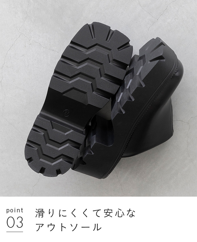 摩擦力の高い合成ゴムソールを使用。さらに、ゴツゴツした凹凸が地面をしっかり捉えて滑りにくくて安心。