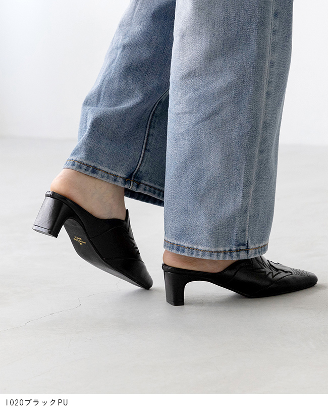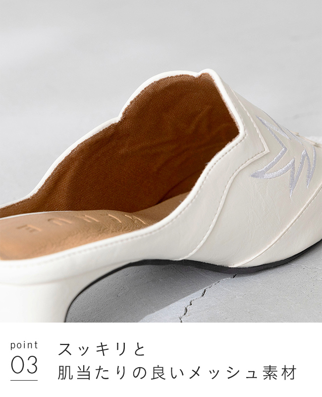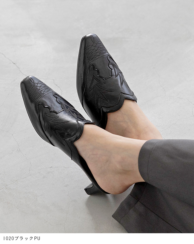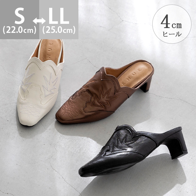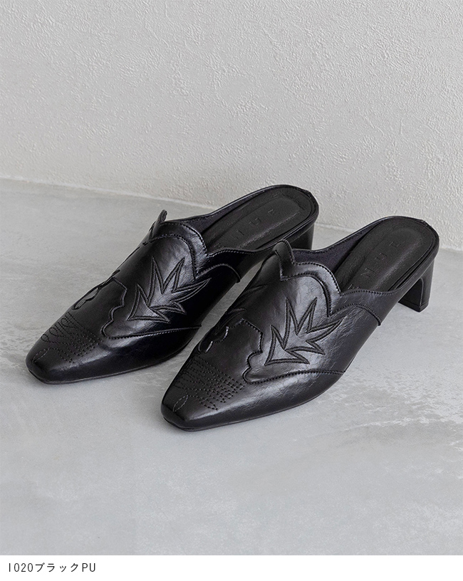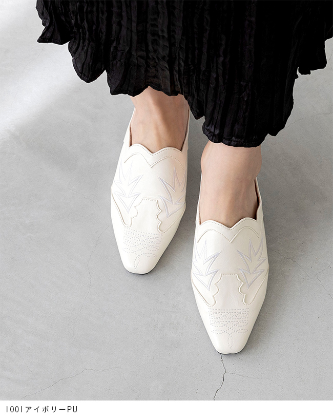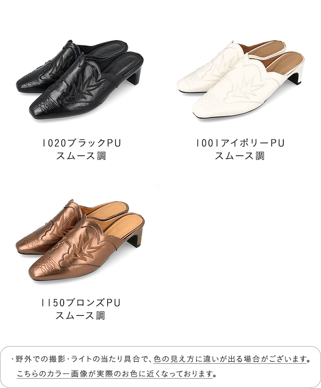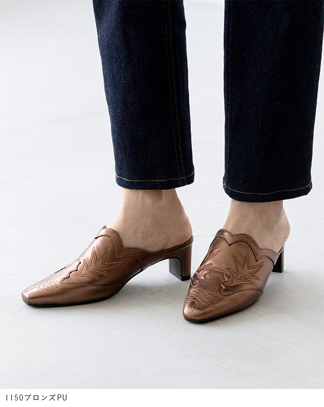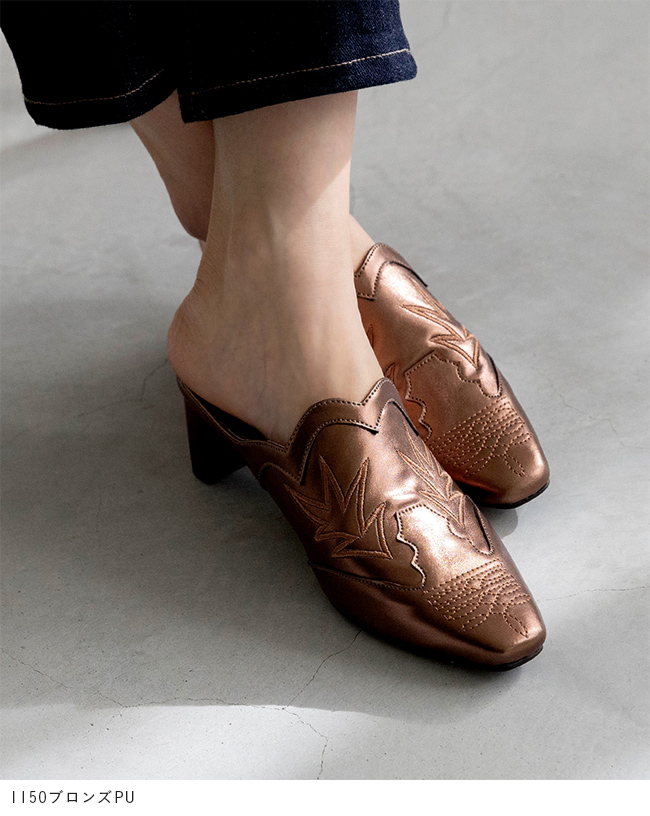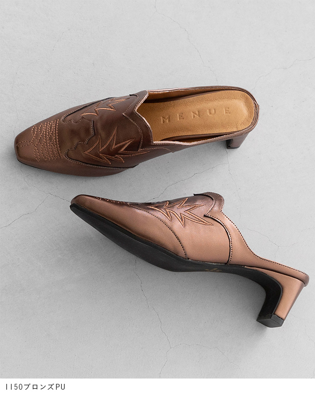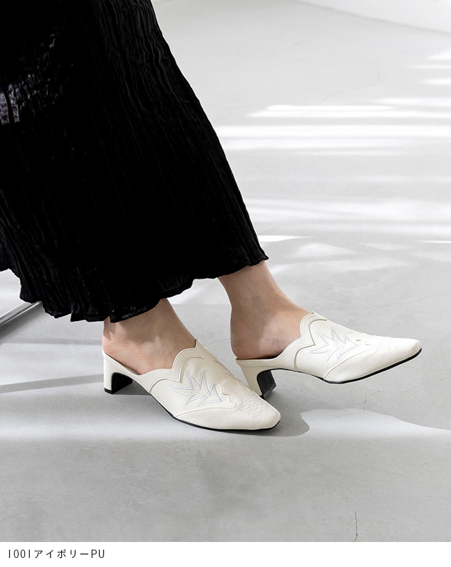 ミュール サンダル ミュールサンダル スリッパ つっかけ かかとなし 履きやすい レディース スクエアトゥ スクエア ウエスタン ウェスタン 刺繍 チャンキーヒール 太ヒール チャンキー 太めヒール デザインヒール 変形ヒール プレートヒール 痛くない 歩きやすい 疲れない 疲れにくい 大きいサイズ 小さいサイズ おでかけ お出かけ カフェ ショッピング 買い物 4cmヒール 4センチヒール ミドルヒール E 白 ホワイト 黒 ブラック 金 ゴールド S 22cm 22.5cm M 23cm 23.5cm 2L LL 25cm L 24.cm 24.5cm 春 夏 秋 冬 スムース調 合皮 PU menue メヌエ outletshoes アウトレットシューズ welleg ウェレッグ