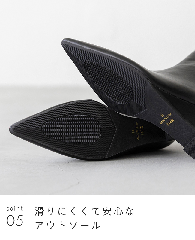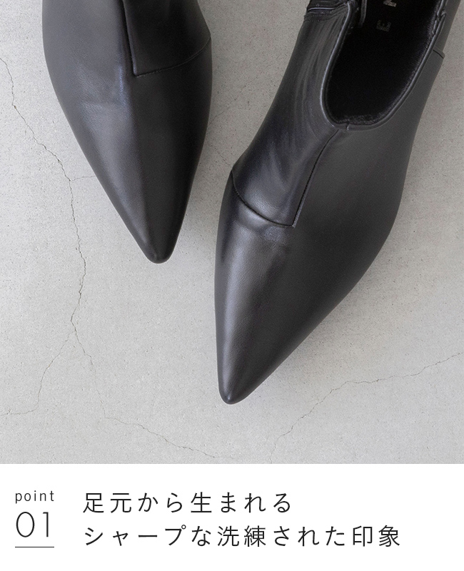 シャープなポインテッドトゥが、足元をすっきりと細く見せ、洗練された大人の女性を演出します。