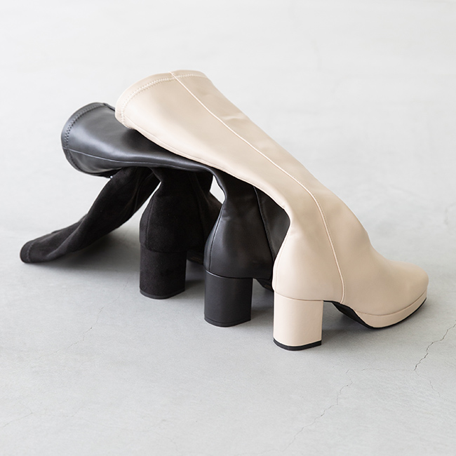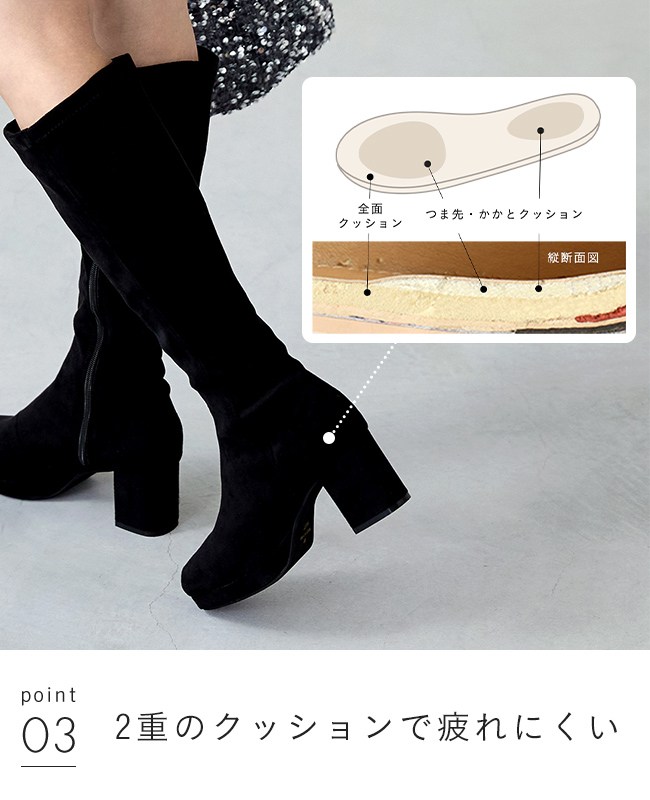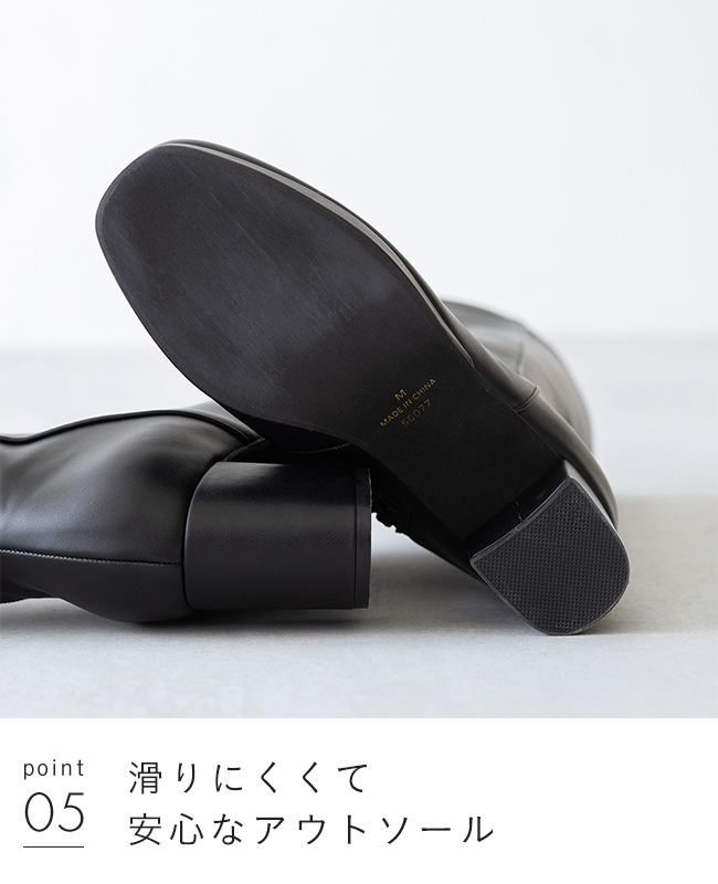 つま先側が厚底のヒールブーツなので、高めのヒールでも傾斜が緩やかになり安定感×疲れにくさUP。