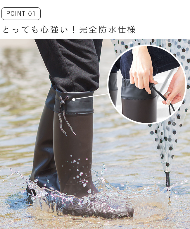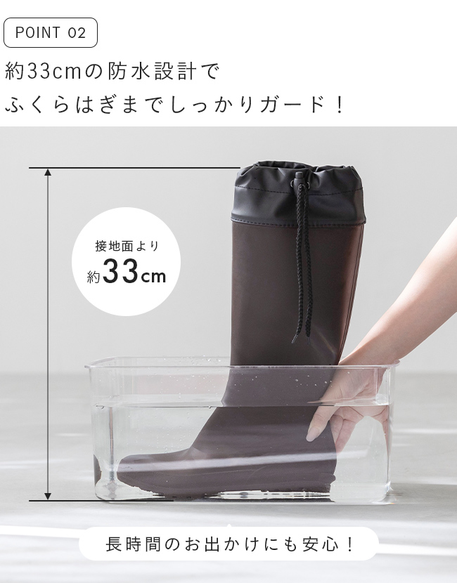 接地面より約33cmまで水の侵入を防いでくれるから、雨や雪の日でも足が濡れる心配がありません。