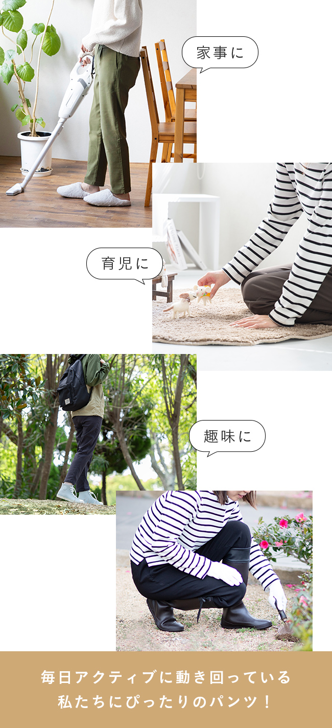 驚くほど伸縮性のある生地を使用したストレッチパンツは、履いていないのかと勘違いするほどの軽さとフィット感♪