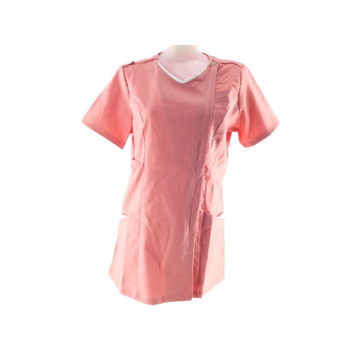前開きスクラブ ストレッチ ギャバ 静電 衿配色 形態安定 レディース 医療用 看護師 介護士 S コーラルピンクxホワイト 送料250円