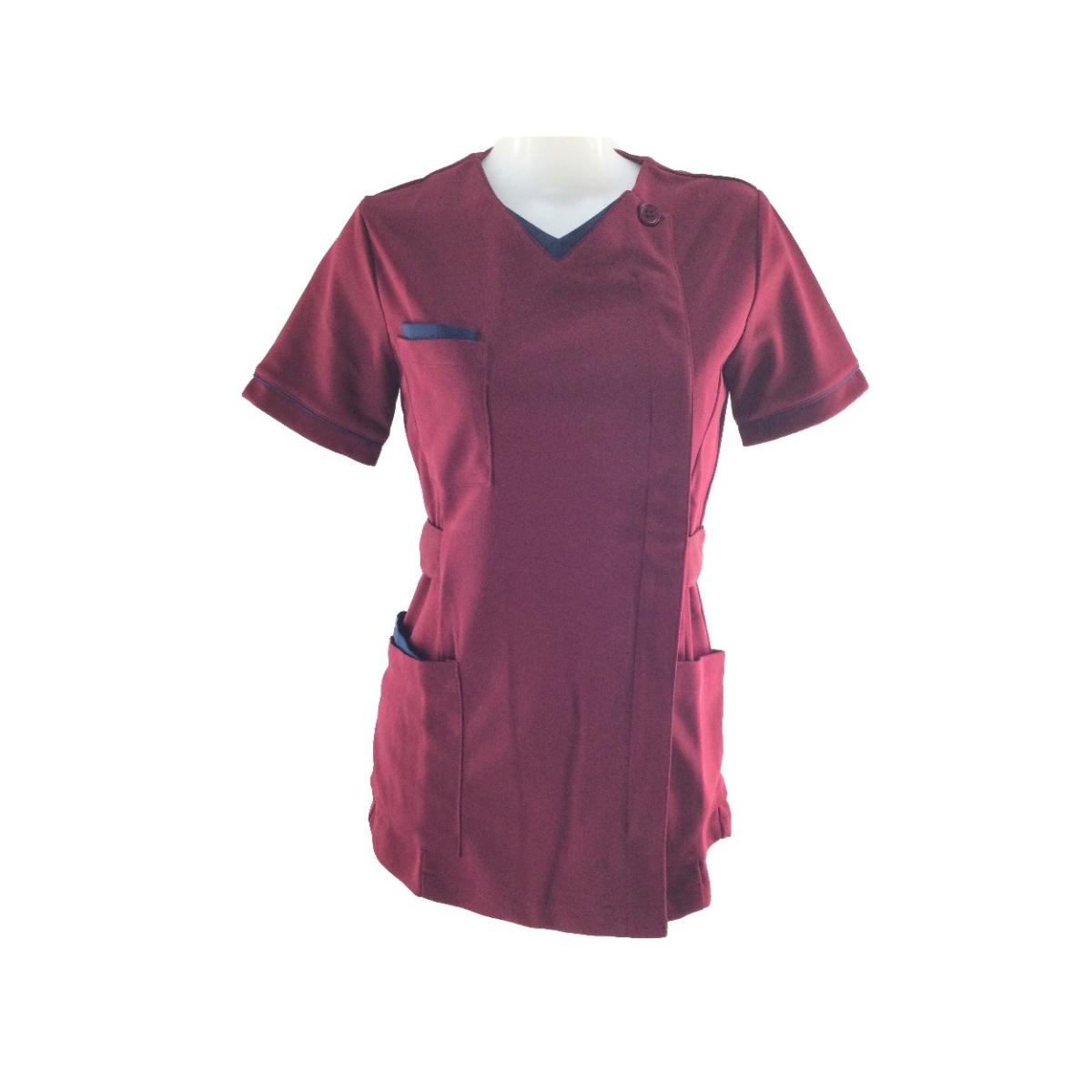 ノーカラー配色前開きジャケット マシュマロストレッチ 医療用 看護師 介護士 SSサイズ バーガンディxネイビー 送料250円