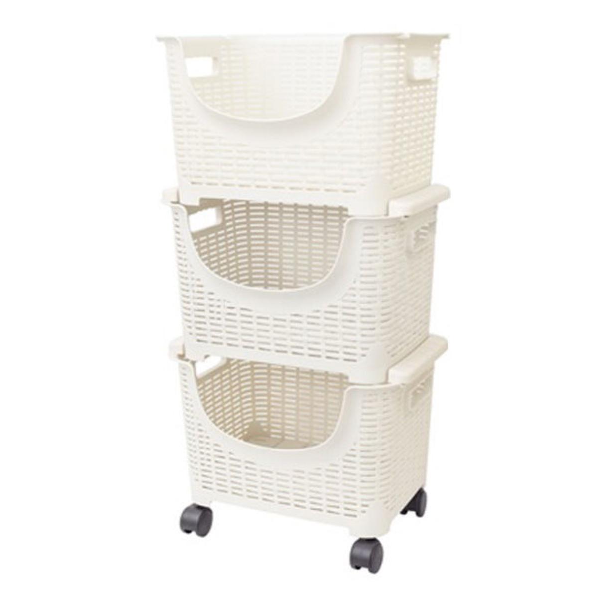 訳あり キャスター付きバスケット 3個セット 重ねて使える 省スペース 36x27x71.5cm アイボリー