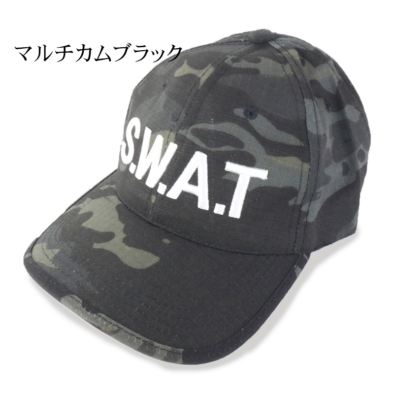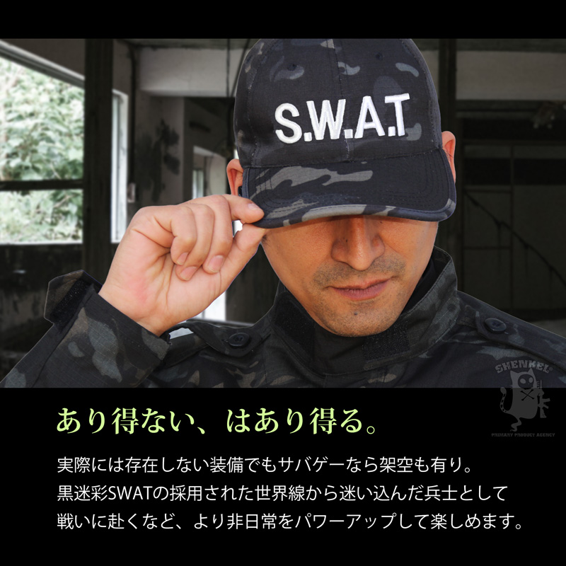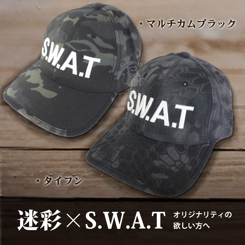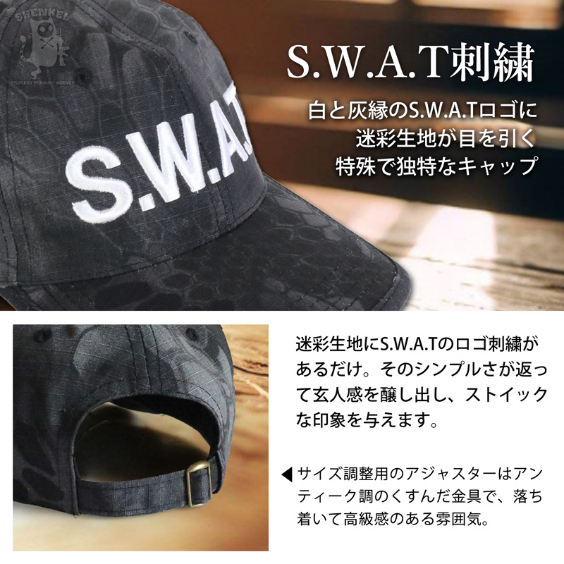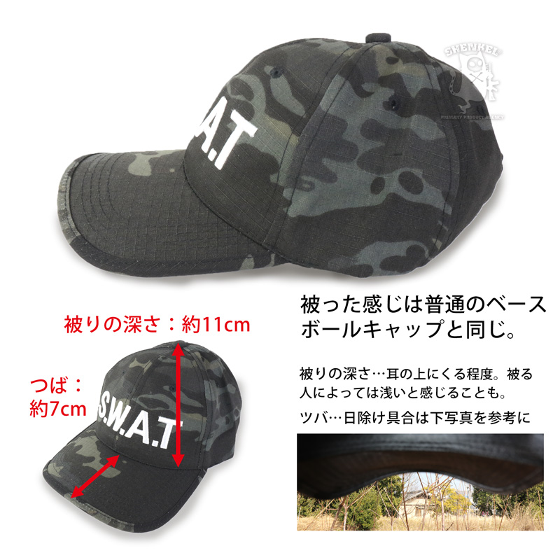 【迷彩×SWAT】SHENKEL製 迷彩柄のSWATベースボールキャップです。ロゴは白とグレーの刺繍。季節を問わない生地を使用しており、サバゲー参戦時、おでこへの被弾防止や頭上の枝などからの保護に役に立ちます。