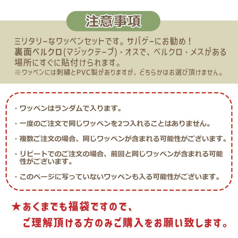 ・このページに写っていないワッペンも入る可能性がございます。☆あくまでも福袋ですので、ご理解頂ける方のみご購入をお願い致します。