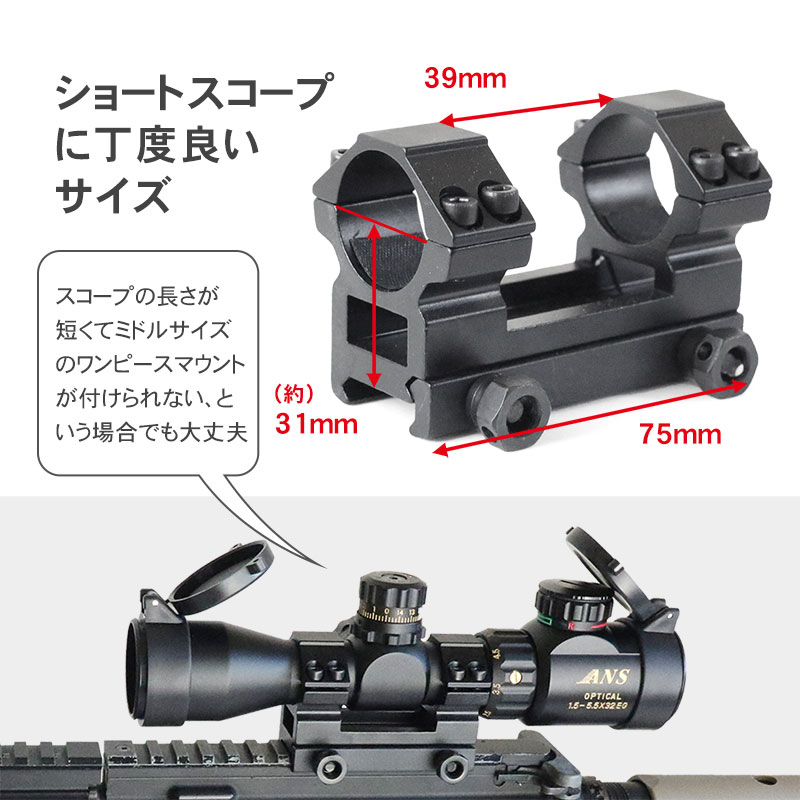■サイズ(約):L75mm×H51mm×W45mm(リング間の幅:39mm) ■対応チューブ径:1インチ(25mm) ■対応レール幅:20mm ■マウント高さ:ローマウント(リング中心からレールトップまでの高さ約31mm)