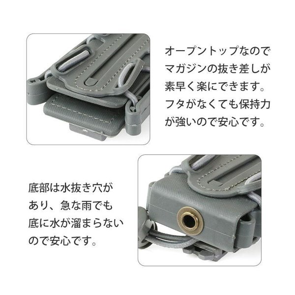 内側は細かい凹凸の滑り止めもあり、マガジンをしっかりと保持できます。バンジーコードでテンションのかかり具合を調整でき、抜き差しもスムーズに行えます。逆さに振っても落ちないので、装備への逆さ付けも可能。