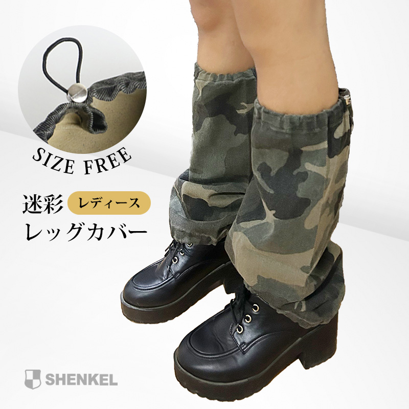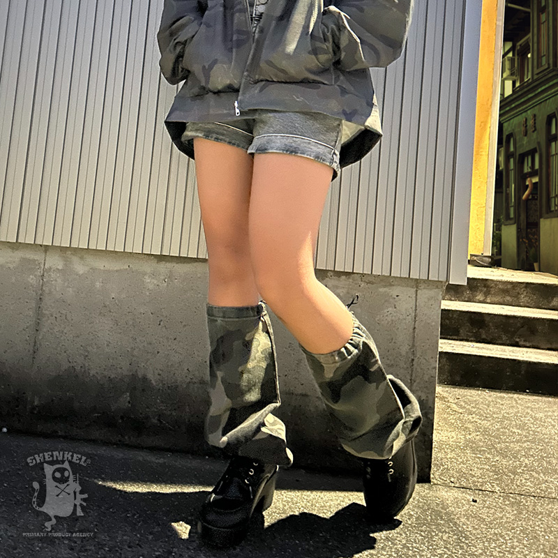 デニムのような生地の、迷彩柄レッグカバーです。くしゅっとしたボリューム感が出て、可愛いくスタイルアップできます。