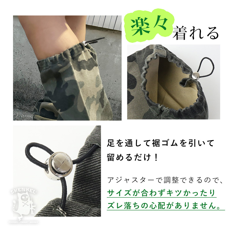 足を通して裾ゴムを引いて留めるだけ!素足はもちろんレギンスや靴下の上からも履けます。アジャスターで調整できるので、サイズが合わずキツかったりズレ落ちの心配がありません。