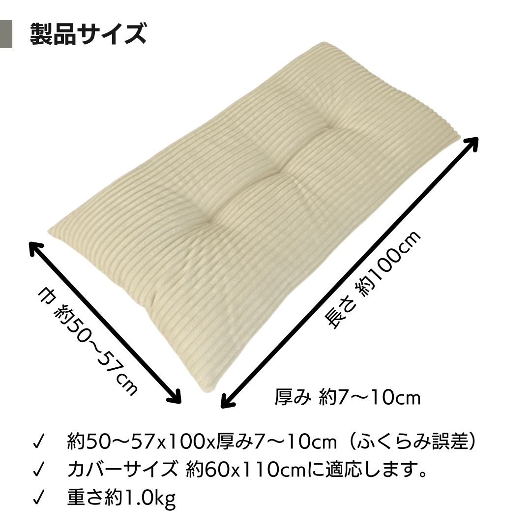 「わた」が入った製品サイズ/巾50〜55×長さ100×厚み7〜10cm(側地サイズ/60×110cm)