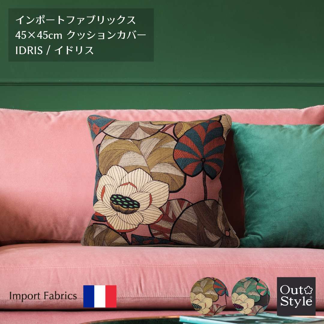 フランスのデザイナーによって描かれたプリント模様。その洗練されたモダンな雰囲気と、大胆なリーフとハスの花のデザインが、お部屋に異国の風を吹き込み華やかさを添えます。
