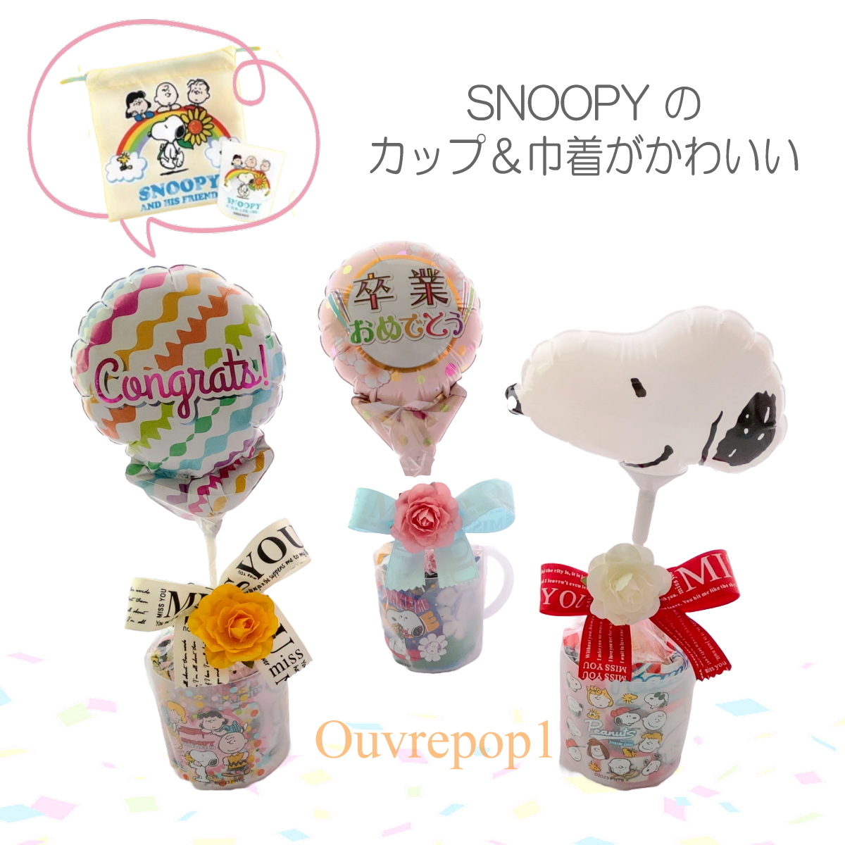 スヌーピー バルーンギフト 【 コップ&巾着 】 選べるメッセージバルーン ホワイトデー 卒業 入学 部活 バレエ ピアノ 誕生日 発表会 プチギフト かわいい