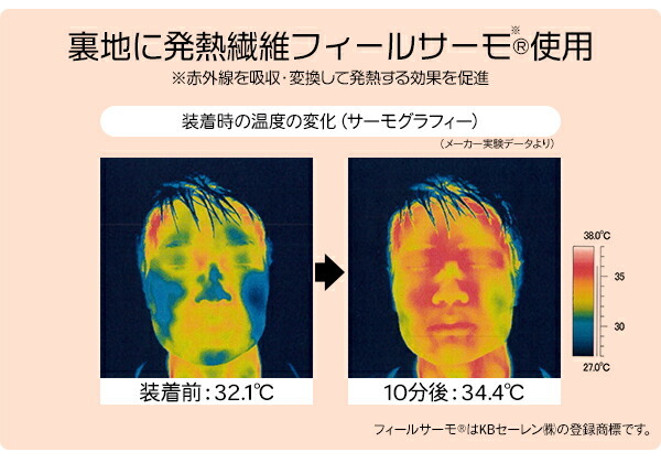 | 裏地に発熱繊維を使用しているので装着して10分後にはじんわりぽかぽか。耳が痛くならないアジャスター付き。軽くて圧迫感のない付け心地。 |