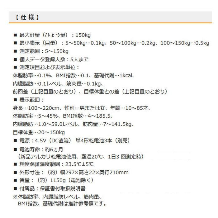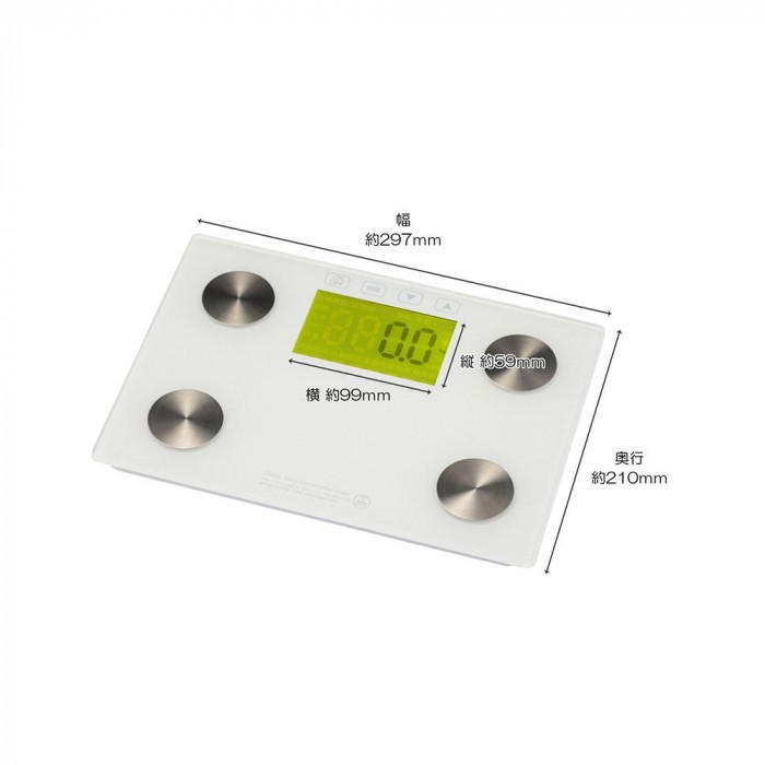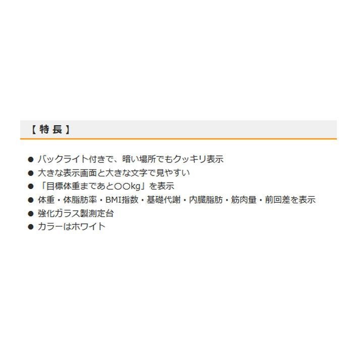 | バックライト付きで、暗い場所でもクッキリ表示!「目標体重まであと〇〇kg」を表示します。体重・体脂肪率・BMI指数・基礎代謝・内臓脂肪・筋肉量・前回差を表示します。強化ガラス製測定台です。 ※ 下記の様な医療機器との併用は、絶対にしないでください。 ・ペースメーカーなどの体内植え込み型医療用電子機器 ・人工心肺などの生命維持用医療用電子機器 ・心電計などの装着型医療用電子機器 これらの医療用電子機器の誤動作をまねくおそれがあります。 |