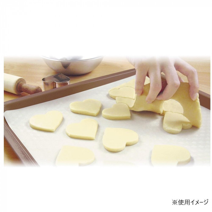 表面は凹凸加工処理が施されており.、クッキーやパン、パイ等の仕込みの際も生地離れがよく、作業も効率的に進みます。裏面はシリコンゴムの高いグリップ力を生かしたすべり止め加工が施されているので、泡立て、大根おろし等の際に下に敷くとすべらず安全で便利です。高い耐熱、耐冷性能があるので本品の上で製菓、調理作業した後キッチンマットごとオーブンで使用できたり、そのまま冷凍、冷蔵保存ができます。