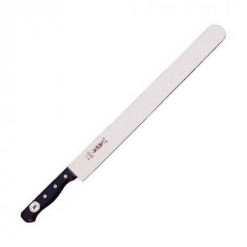 | 柄は黒合板(強化積層木材)を使用しています。固くて丈夫な木製柄です。カステラなどのスポンジ状の長い物を切るのに大変便利です。カステラ等は牛刀などでも切れますが、切断面に切り返しの段がつきやすいです。その点、この刀身が細長いカステラナイフを使えば切断面が綺麗になります。食材に刃を当て前に押して刃が食材に入ったら、手前に引いて切ってください。これは、刀身の長さを利用し且つ切れ味を鋭くする切り方です。 切断する物より大きめのサイズをお選び下さい。刃にステンレスを使用したのは訳があります。カステラ等のお菓子類には糖分、塩分、アルコ-ル、油分など金属を酸化(サビ)させる成分が多く含まれています。これらに対応すべく錆びにくく切れ味を確保したステンレスモリブデン鋼を使用しました。さらに使用した後は、刀身にお湯または水をかけ、フキン等でさっと拭いていただくだけでOKです。このメンテナンスの気楽さはステンレスならではです。使用用途としてカステラやケ-キ等にはもちろん、切断面に切り返しの段がつきにくいので、大きな食材のスライスも向いています。業務用カステラナイフとしてケ-キ職人にも人気をの包丁です。 ※モニターの発色の具合によって実際のものと色が異なる場合があります。 |