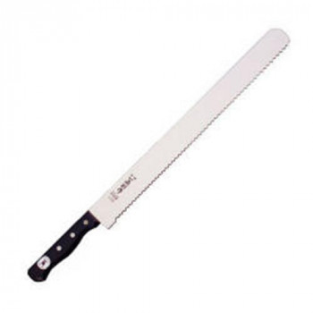 | ステンレスモリブデン鋼材(8A)使用のカステラナイフです。切断能力は直刃タイプより高くなっています。柄は黒合板(強化積層木材)を使用し、固くて丈夫な木製柄です。カステラなどのスポンジ状の長い物を切るのに大変便利です。カステラ等は牛刀などでも切れますが、切断面に切り返しの段がつきやすいです。その点、この刀身が細長いカステラナイフを使えば切断面が綺麗になります。 使用方法としては、まず食材に刃を当て前に押して刃が食材に入ったら、ノコギリのように前後して切ります。鋭い波刃が食材に食い込んでゆくのが解ります。切断する物より大きめのサイズをお選び下さい。刃にステンレスを使用したのは訳があります。カステラ等のお菓子類には糖分、塩分、アルコ-ル、油分など金属を酸化(サビ)させる成分が多く含まれています。これらに対応すべく錆びにくく切れ味を確保したステンレスモリブデン鋼を使用しました。さらに使用した後は、刀身にお湯または水をかけ、フキン等でさっと拭いていただくだけでOKです。このメンテナンスの気楽さはステンレスならではです。使用用途としてカステラやケ-キ等にはもちろん、切断面に切り返しの段がつきにくいので、大きな食材のスライスも向いています。業務用カステラナイフとしてケ-キ職人にも人気の包丁です。 ※この包丁は片刃ですので右利き専用となっております。 ※モニターの発色の具合によって実際のものと色が異なる場合があります。 |