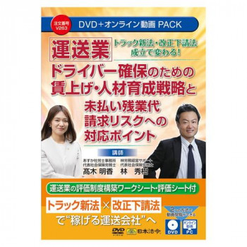 | 仕様 | 【講師】 あすか社労士事務所・代表社会保険労務士・高木明香 林労務経営サポート・代表社会保険労務士・林秀樹 【目次】 1.トラック新法成立と改正下請法を武器に伸びる運送会社になるための3つの条件 2.ドライバーを確保して、訴えられないための賃金制度5つのポイント 3.トラック新法時代の人材育成と評価制度のポイント 【収録時間】 200分 【収録書式】 評価制度見える化ワークシート(目標・ドライバー・事務職・倉庫作業員・配車担当)PDF 運送業評価シート(ドライバー・事務職・倉庫作業員・配車担当)Excel |