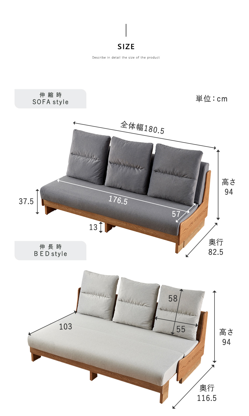 幅 : 180.5 × 奥行 : 82.5 × 高さ : 94 (cm)