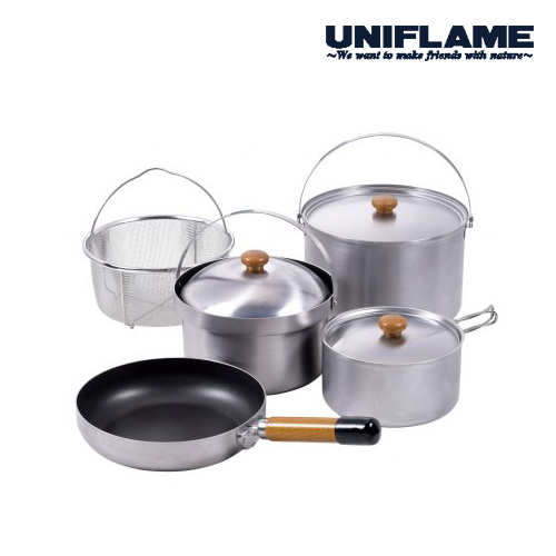 ライスクッカー、フライパン、ステンレス大鍋、ステンレス片手鍋、メッシュバスケットの5点セット。