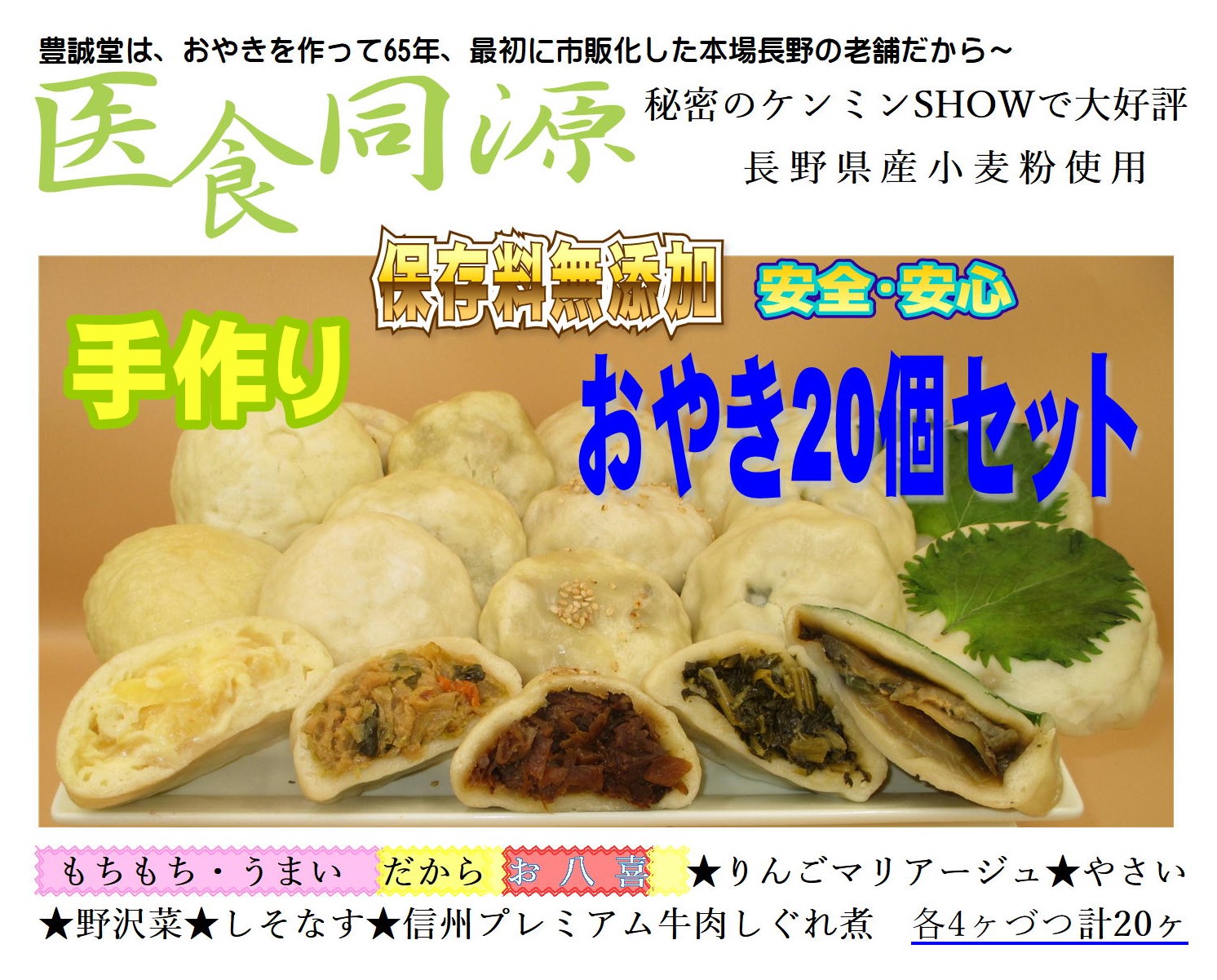 信州プレミアム牛肉しぐれ煮おやき:信州の豊かな自然の中で育った信州牛、その信州プレミアム牛肉を牛蒡とじっくりと煮込み、大変美味です。野沢菜おやき:厳しい寒さの中で育った野沢菜は柔らかく甘みがより感じられます。本場物の野沢菜の旨味をご堪能ください。りんごマリアージュおやき:日差しをいっぱい浴びて紅く甘く実った信州りんごの味を生かし、カスタードクリームと手包みしたおやきです。しそナスおやき:特産の丸ナスにカロチン・ミネラルなどを多く含んだ青じそ味噌で味付けし、ナスの上にも青じそをのせました。風味豊かな美味しいおやきです。 野菜ミックスおやき:契約栽培で育てたキャベツ玉葱人参などの新鮮な野菜を信州みそで味付けした素朴な味です。