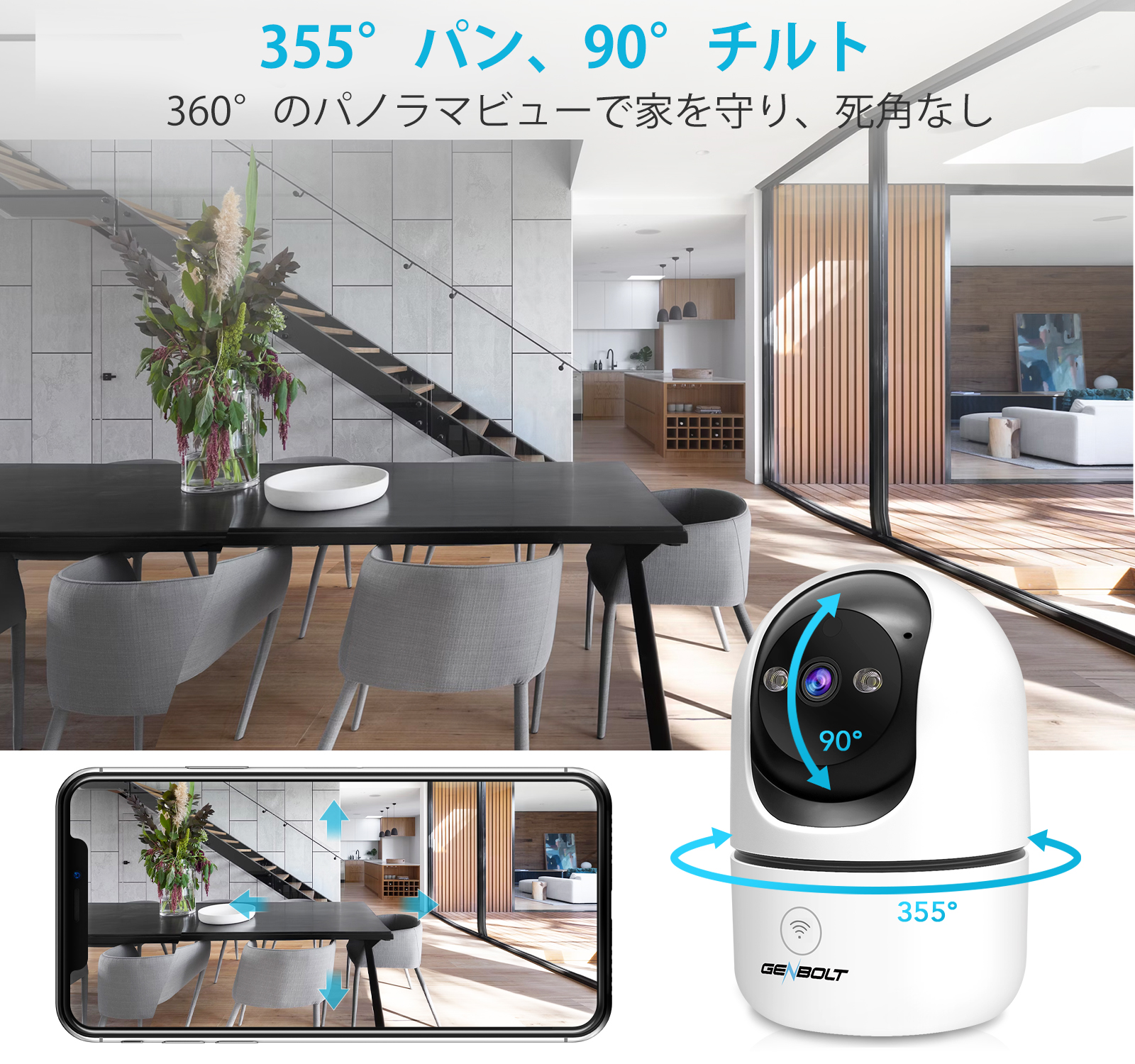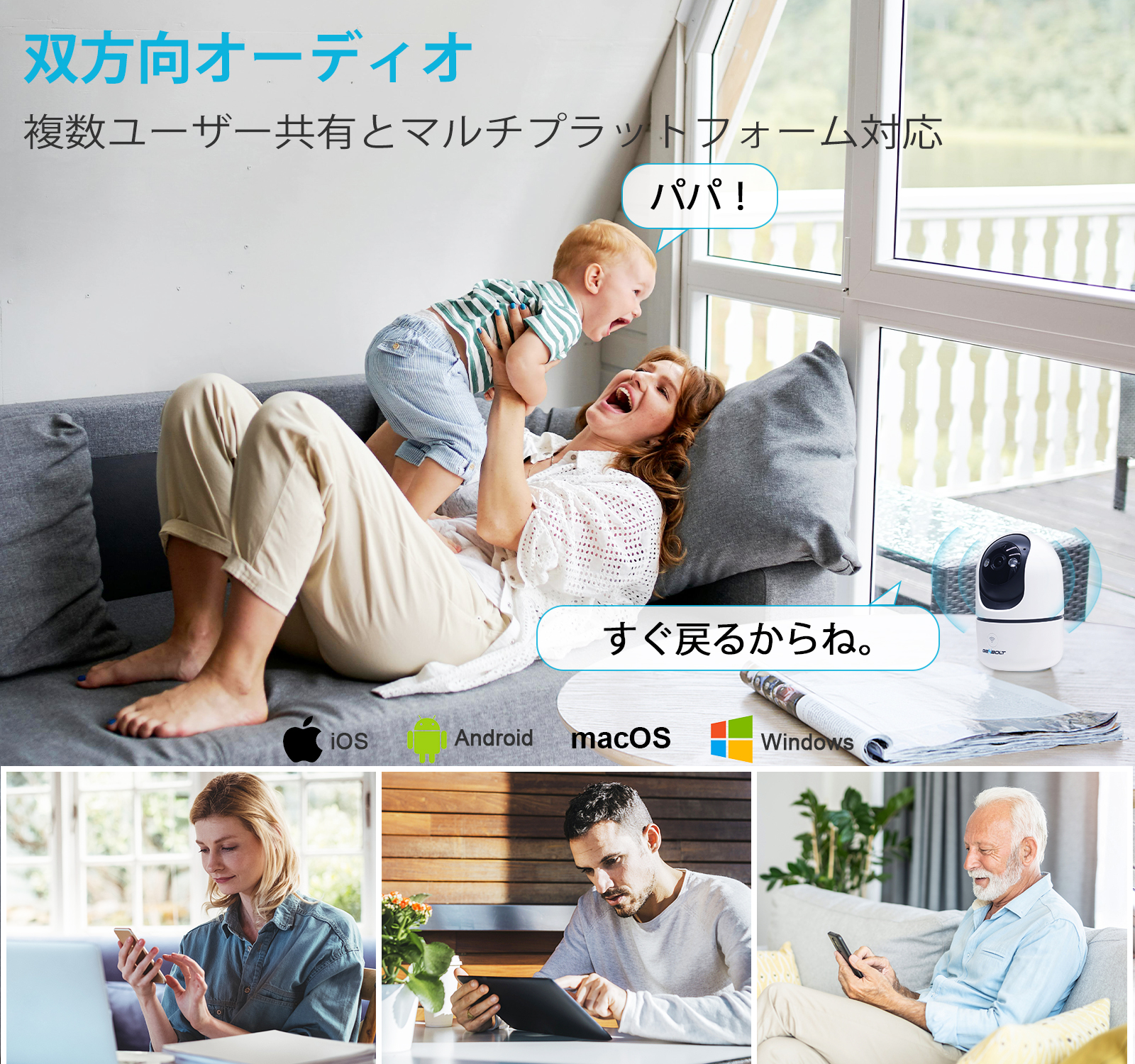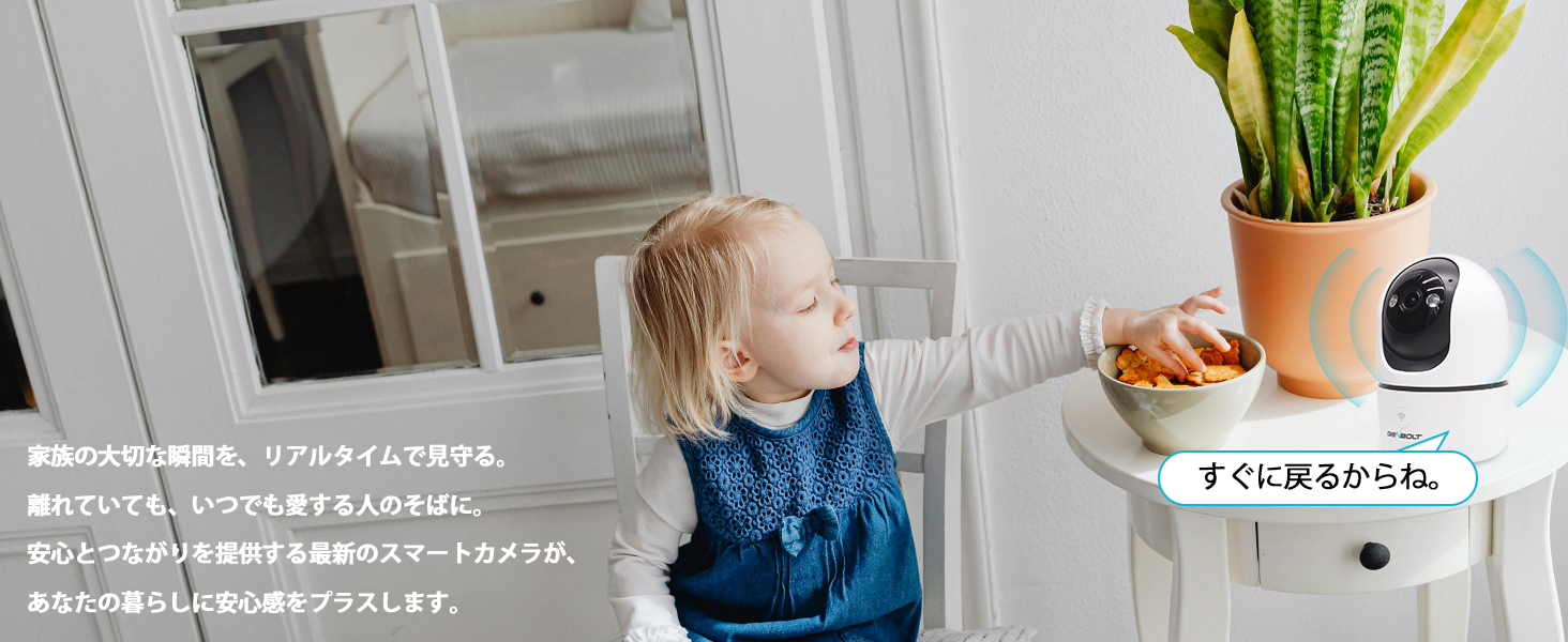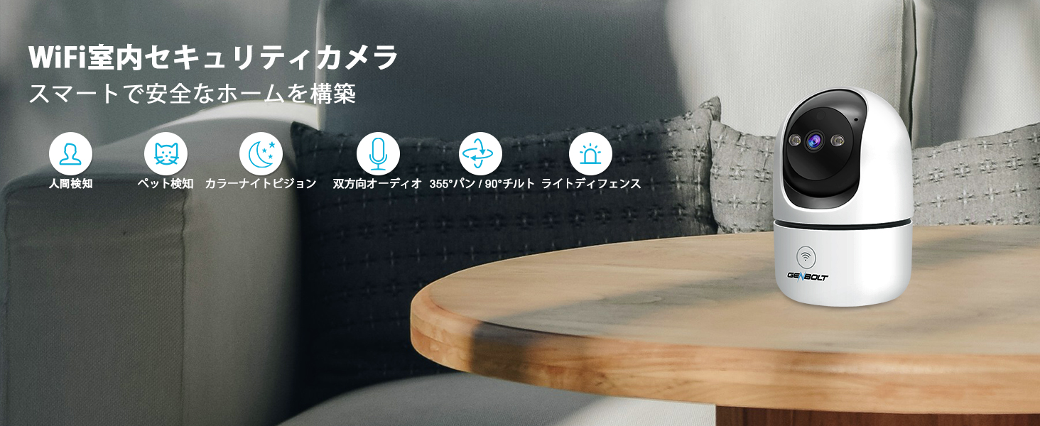 5)双方向音声:カメラの本体に内蔵されたマイクにより、スマホでGENBOLT CAMアプリを通してご家族との通話することができます.