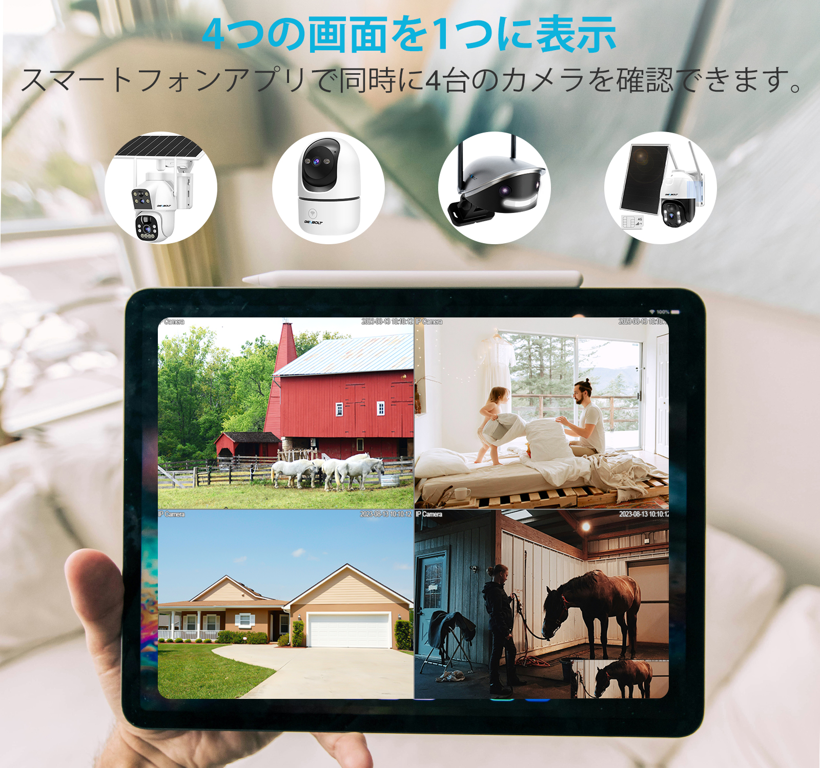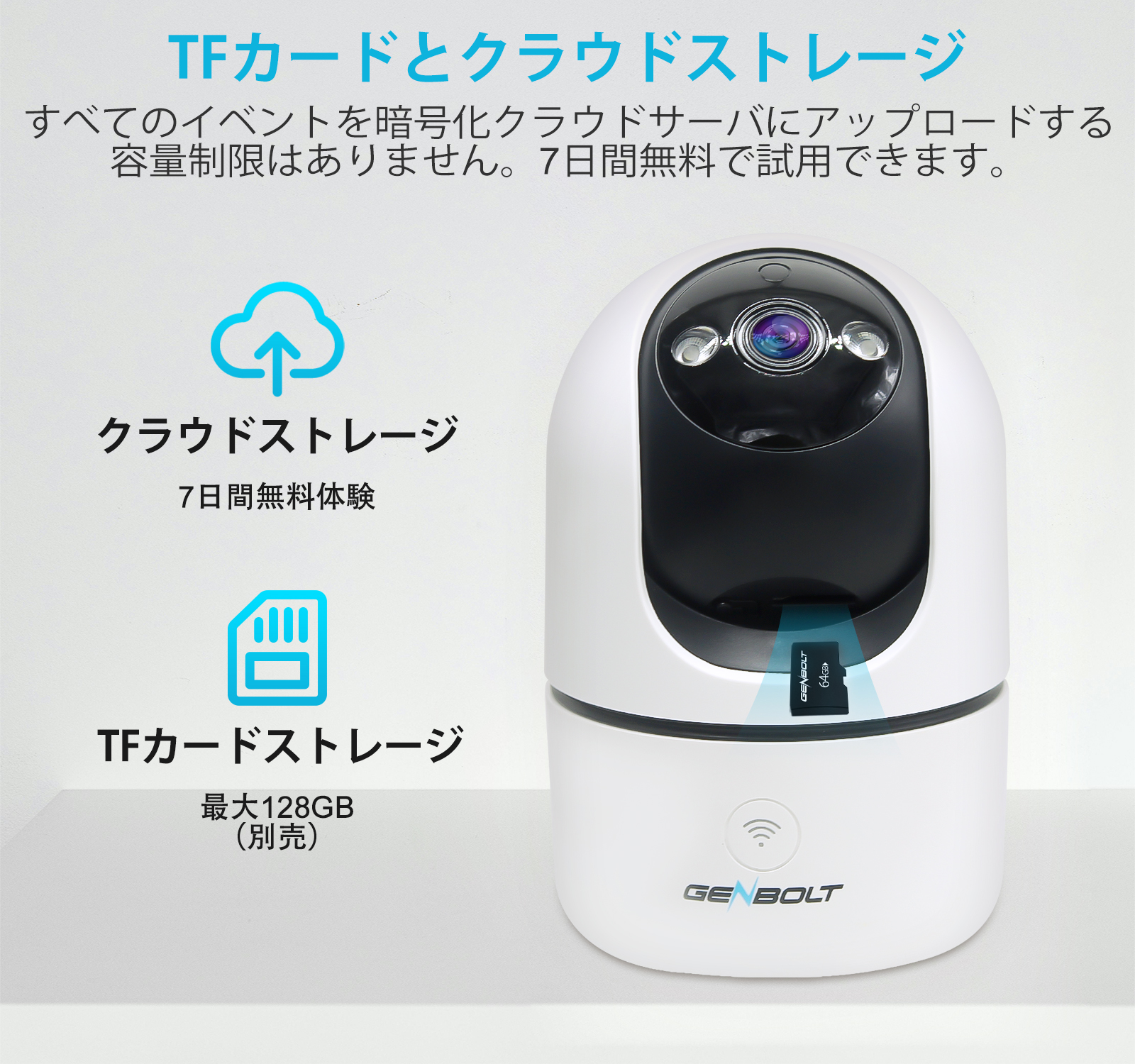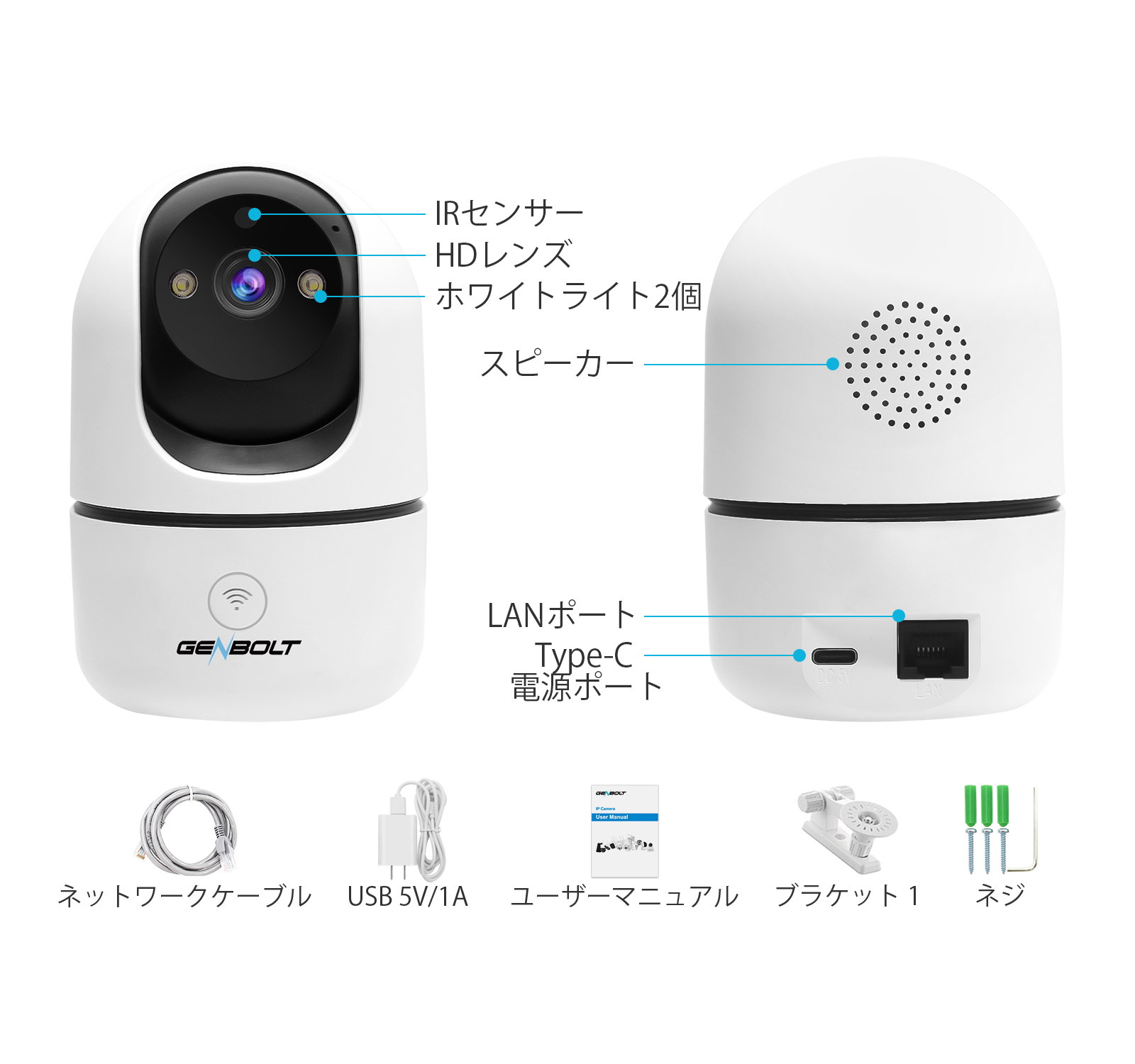5)双方向音声:カメラの本体に内蔵されたマイクにより、スマホでGENBOLT CAMアプリを通してご家族との通話することができます.