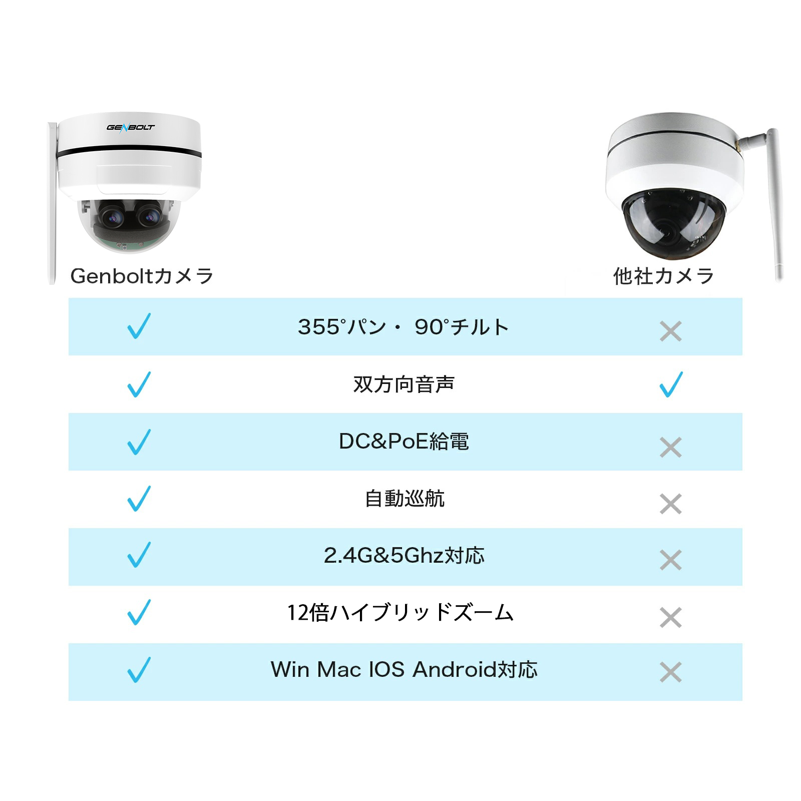 3)遠隔操作+パンチルト:専用アプリ「GENBOLT CAM」の画面をスワイプしてカメラの角度を変えられるので、いつでも簡単に角度の変更ができます。水平旋回320度、垂直旋回90度に対応しています。
