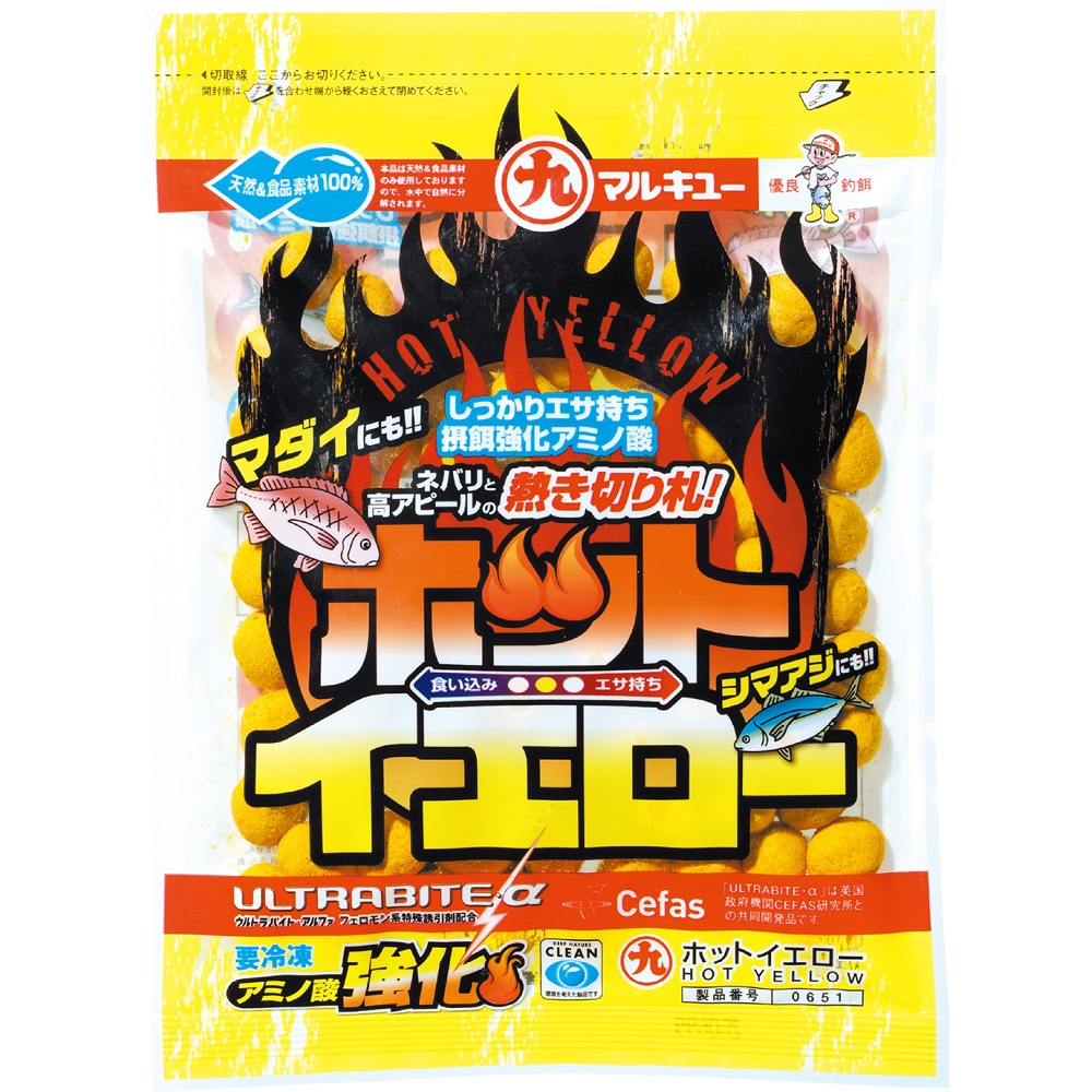 海上釣り堀で抜群の実績を誇る、視認性が高い黄色いダンゴエサに、特にエサ取りが湧く高水温時でも安心して使えるようにネバリを調整。エサ持ち抜群で、アタリが出るまでじっくり誘えます。そして、ゆっくり溶け出すので黄色い帯が離れたターゲットにも強烈アピール。大型のイケスでも自分の釣り座に魚を引き寄せるパワーを備えています。マルキユー海上釣り堀エサは、得意とする食いを立たせるアミノ酸と、フェロモン系特殊誘引剤である『ウルトラバイト・アルファ』を最適強化し、デフォルト配合。摂餌効果を高基準で高めています。2〜3粒のダンゴを練り合わせて、マダイ、シマアジはガッチリ攻略。引き出しとして5〜7粒のデカダンゴで青物にも有効です。ネバリと高アピール、そしてゆるぎない摂餌力の「ホットイエロー」を切り札に、ターゲットも釣り人も熱くなれ!