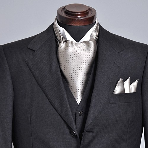シルク100%の日本製!セレモニーやパーティーシーン、オフスタイルを上品に彩るアスコットタイ。同生地のポケットチーフ付き