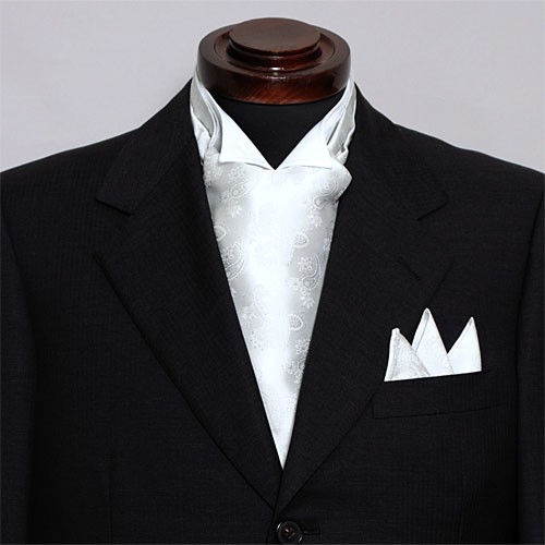 シルク100%の日本製!セレモニーやパーティーシーン、オフスタイルを上品に彩るアスコットタイ。同生地のポケットチーフ付き シルバー