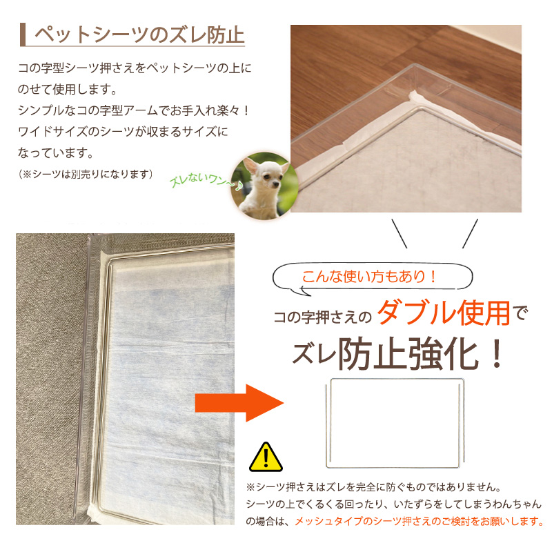 ■シーツのズレを防止するステンレス製のコの字型ステンレスアームコの字型アームをペットシーツの上にのせて使用します。