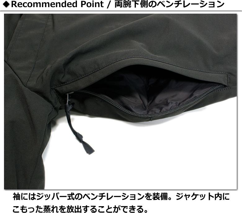 両脇下にはベンチレーションジッパーが付き、開けると通気が出来ます。