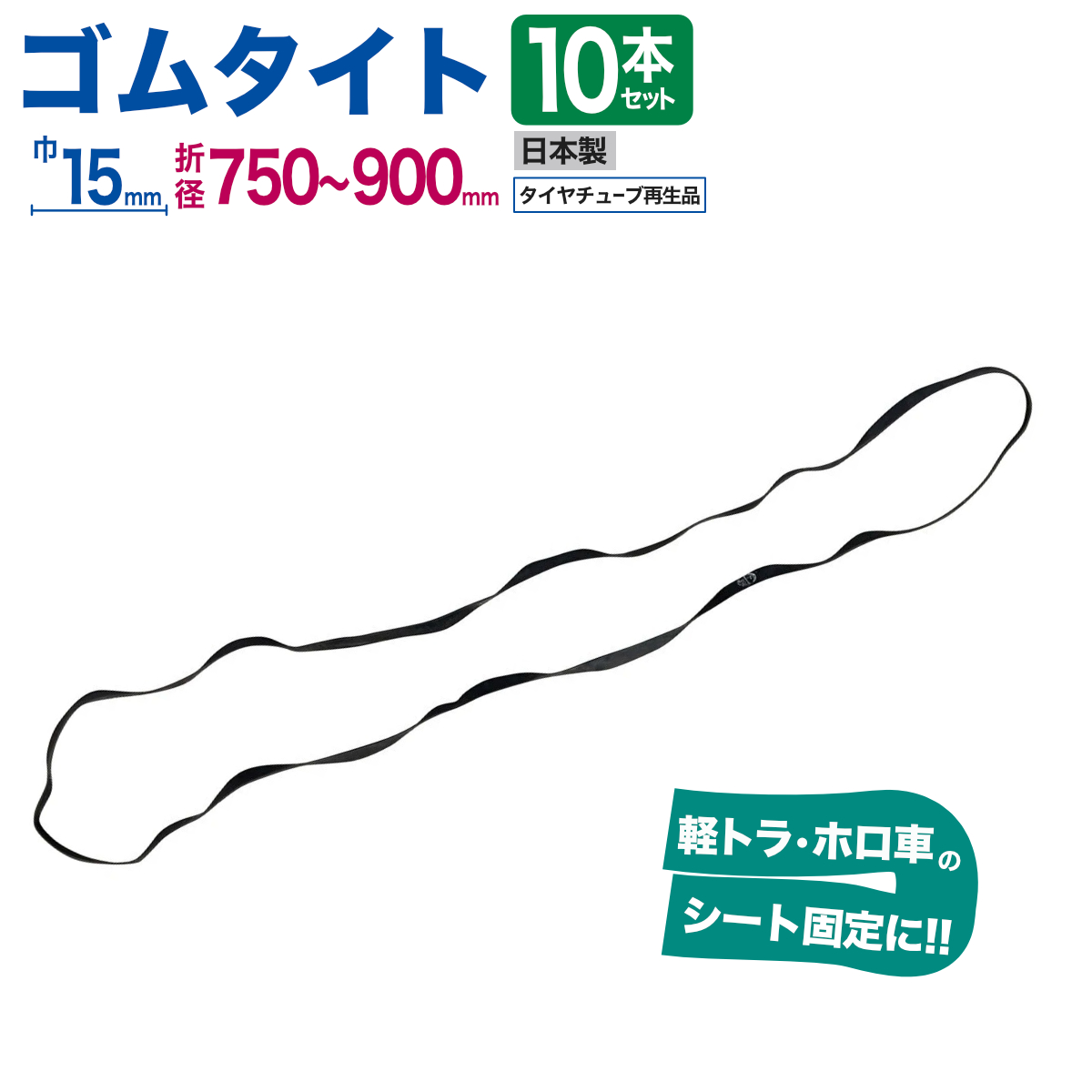 ゴムタイト 幌用 10本入 幅15mm 折径750〜900mm タイヤチューブ再生品 トラック 軽トラ シート固定 ゴムバンド ロープ ベルト 紐